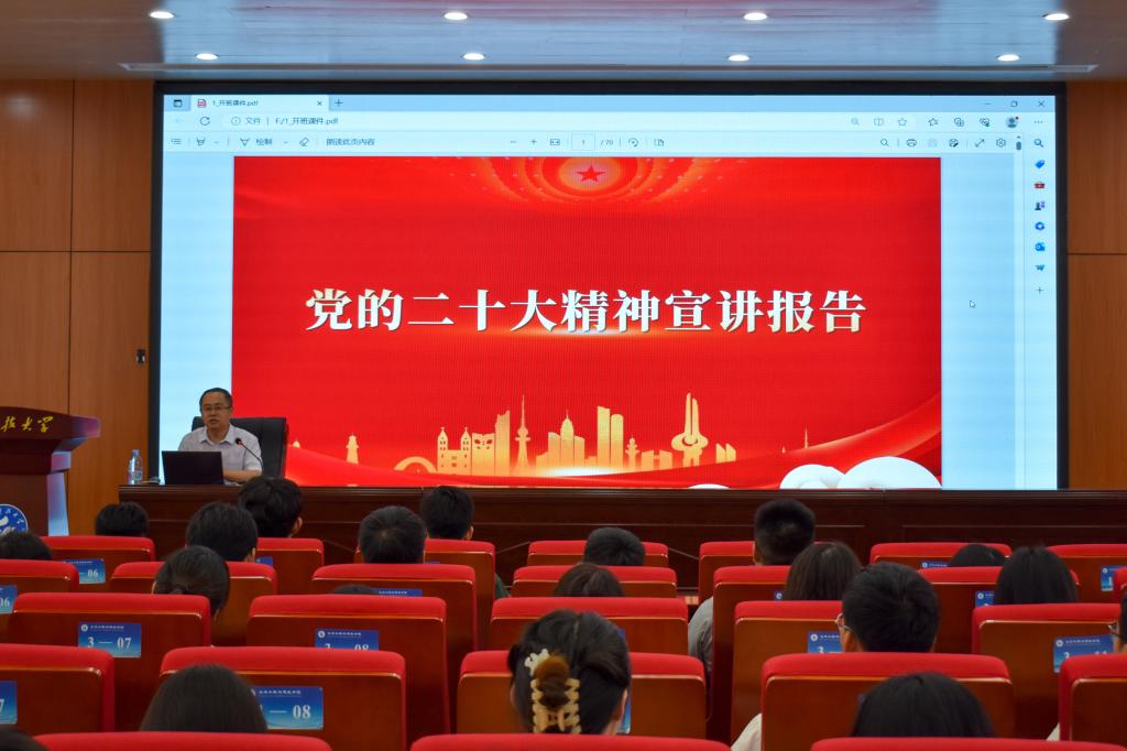 6月13日,pp电子游戏官网院长王崇革在J15-136会议室为学院学生党员讲解党的二十大精神。学院毕业生党员代表、联系党支部全体党员及联系班级全体学生参加党课学习。