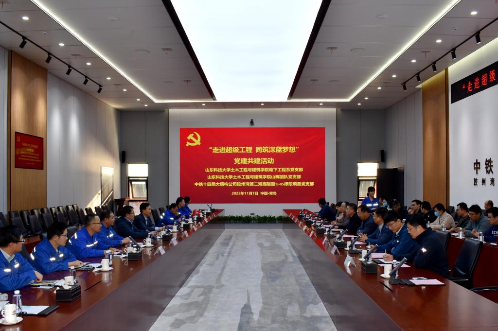 11月7日,pp电子游戏官网党委理论学习中心组联合地下工程系党支部与山晖团队党支部一行27人赴胶州湾第二隧道工程现场参观学习。中铁十四局集团有限公司工程管理部部长孙亮、大盾构工程有限公司副总经理路开道、盾构管理中心主任吴玉礼、胶州湾第二海底隧道项目部党支部书记季璐等企业负责人陪同参观并出席座谈交流会。