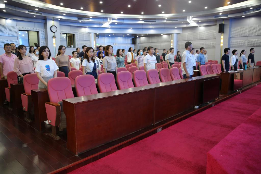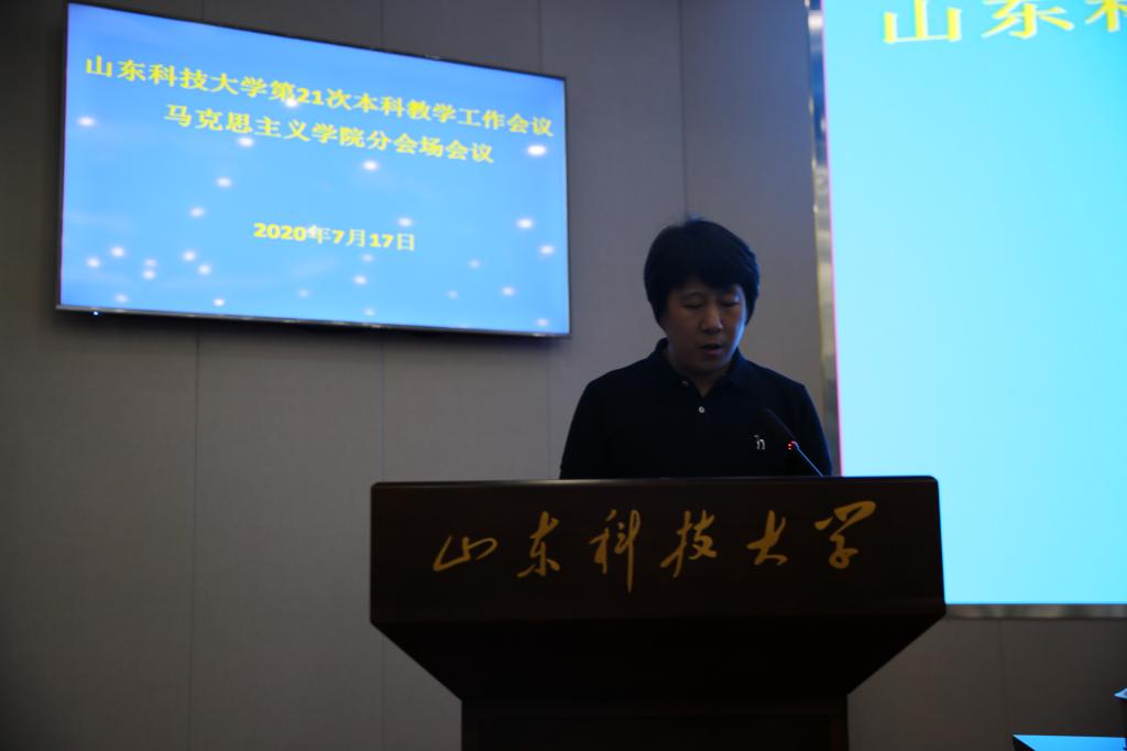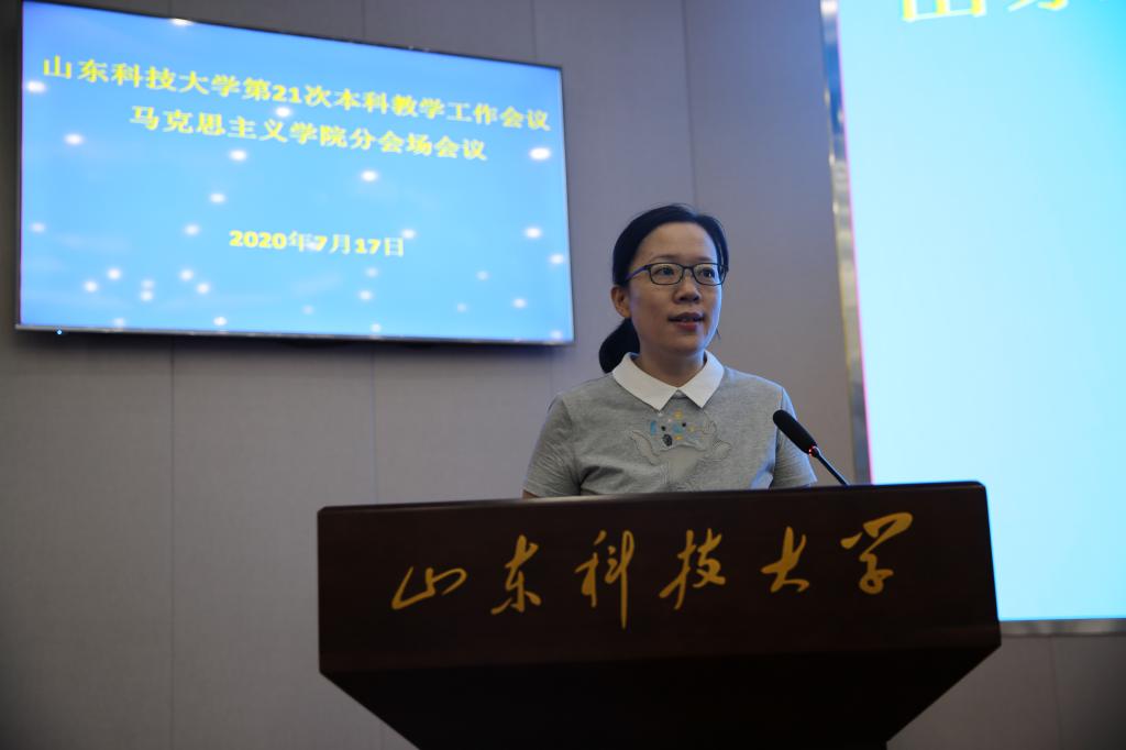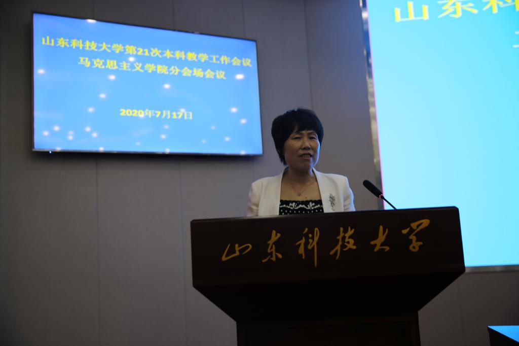 学院全体教职工奏唱国歌,会议开始。副院长常春作学院教学工作报告,她从课程体系建设、混合式教学模式构建、实践教学和创新创业教育、教师教学能力培养、社会关注等五个方面对学院三年来的思政课教学工作进行了全面回顾,对学院思政课教学目前所面临的机遇和挑战进行了分析,对学院 “十四五”期间教学工作提出了思路、目标和任务。