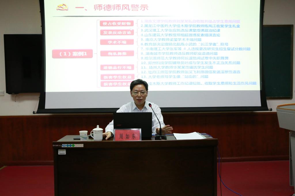 周如东教授的报告分为师德师风警示、学术科研警示、财经纪律警示、违反八项规定精神警示、工作不力问责警示、其它违纪警示等六个方面,从近年曝光、查处的高校违规违纪案例入手进行案例分析,在现实的案例中解读党规党纪与法律法规,以此警示全体党员同志以案为鉴、闻警自省,做到心有所畏、言有所戒、行有所止。