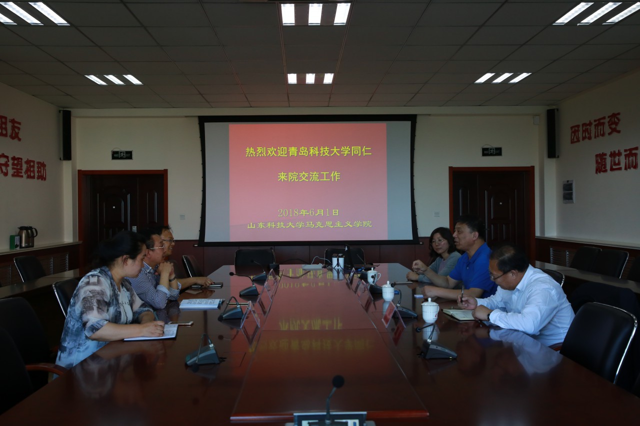 6月1日下午,青岛科技大学beat365正版唯一官网必一院长曹胜、副院长曲慧敏、马克思主义理论研究中心主任杜裕禄一行来院进行工作交流。院长逄奉辉、副院长邵勇、院长助理常春在J9-223会议室接待了客人。