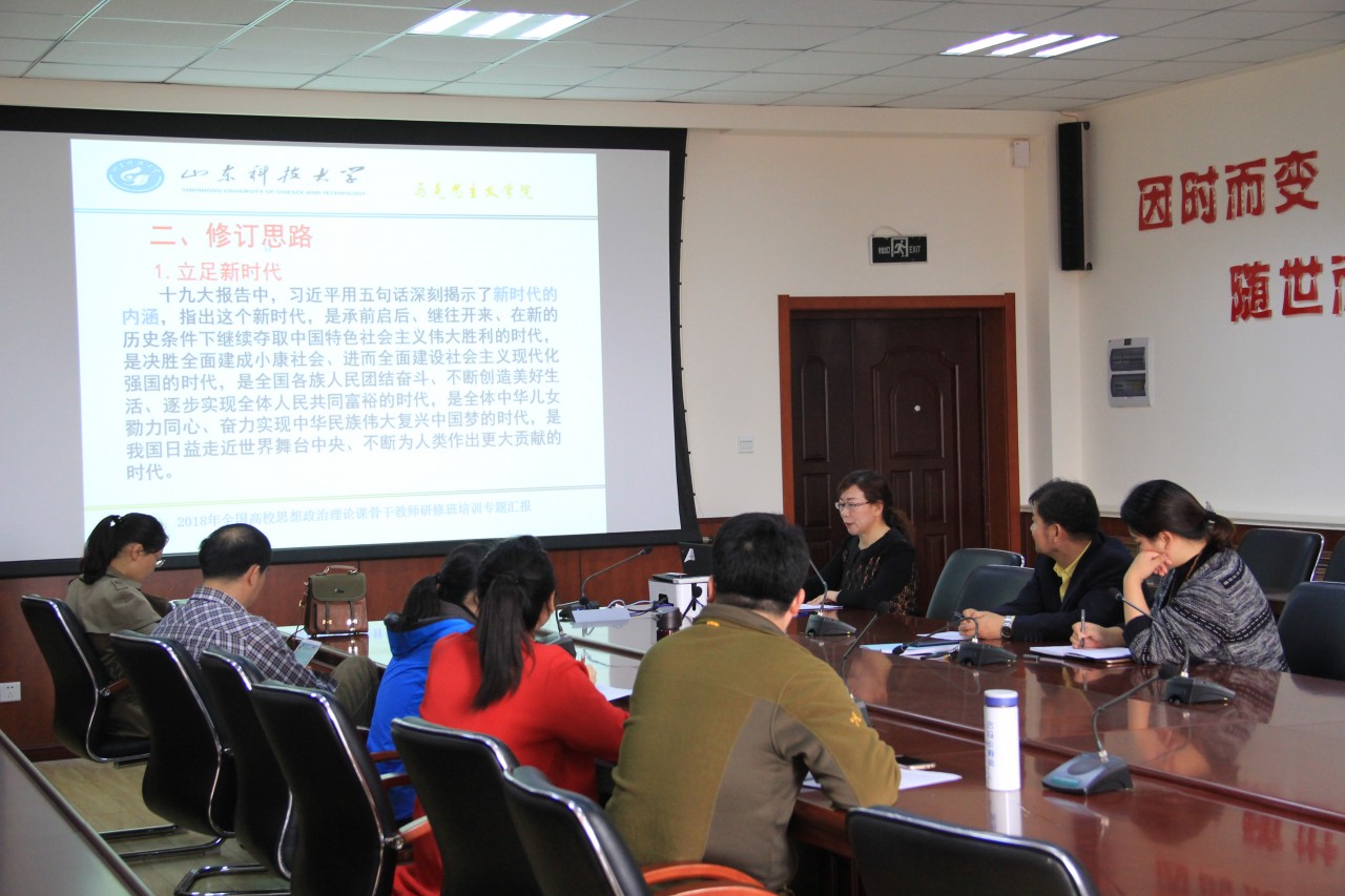 会议听取了张东玲副教授参加中宣部、教育部举办的2018年全国高校思想政治理论课骨干教师研修班有关情况的汇报和关于《“基础”课新教材的修订情况及教学建议》专题报告,并围绕新时代培养什么样的人、怎样培养人、为谁培养人以及《思想道德修养与法律基础》教材修订过程、修订思路、框架结构和教学建议等进行了深入研讨。明确了《思想道德修养与法律基础》课程落实新思想和党的十九大精神的教学计划与实施方案。