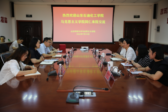 7月19日上午,山东石油化工学院beat365正版唯一官网必一院长尹健一行四人来院交流。副院长常春、高明,教师代表毛雪婷、史璇与来宾进行了座谈。