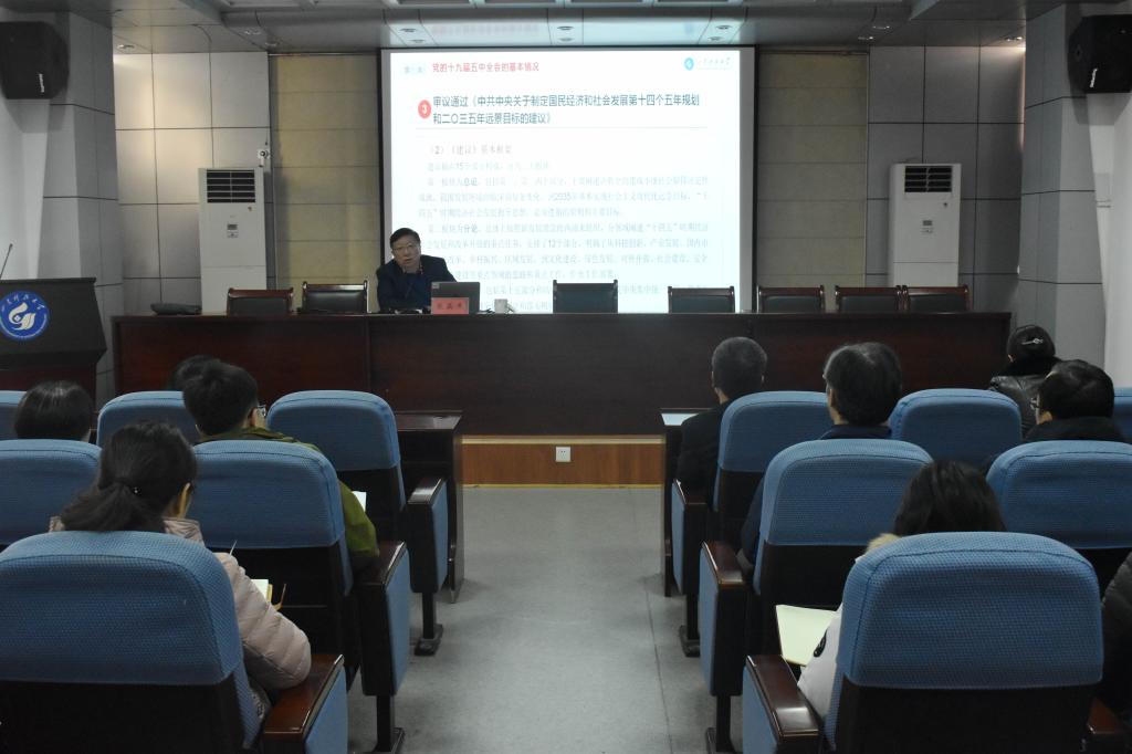 张英杰以《新阶段新理念新格局——党的十九届五中全会精神解读》为题,从学科培养体系出发,逻辑清晰地从基本情况、主要精神、学习重点三个方面对党的十九届五中全会精神进行系统解读,并结合学校实际和个人亲身经历,分享个人对深入学习贯彻党的十九届五中全会精神的感悟体会。张英杰指出,党的十九届五中全会谋划长远,立足五年,着眼十五年,放眼百年,为中国擘画了一幅波澜壮阔的新图景,实践再次证明,有习近平同志作为党中央的核心、全党的核心领航掌舵,有全党全国各族人民团结一心、顽强奋斗,我们就一定能够战胜前进道路上出现的各种艰难险阻,一定能够在新时代把中国特色社会主义更加有力地推向前进。最后,张英杰强调,学校师生均应深入贯彻落实党的十九大、党的十九届五中全会精神,为开启全面建设社会主义现代化国家新征程、开创新时代现代化强省建设新局面,为把我校建设成为工科主导、特色鲜明的高水平应用研究型大学贡献自己的力量。