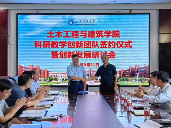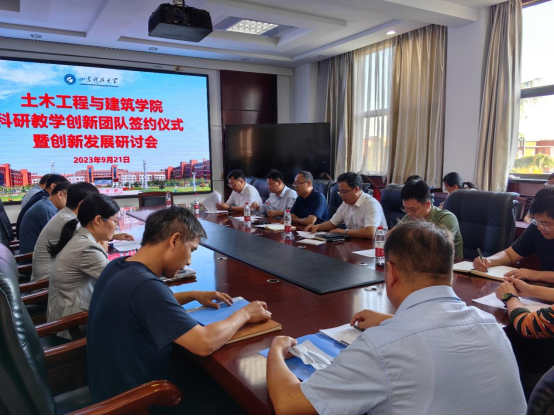 王崇革代表学院与3支科技创新团队(海洋光伏新型结构科研创新团队、城市轨道交通隧道灾害防控创新团队、双碳背景下城市更新与乡村振兴创新团队)和4支优秀教学团队(土木工程专业核心课程教学团队、土力学教学优创团队、暖通空调教学团队、建筑学“基础教学”课程群建设教学团队)进行了签约。团队负责人代表张雨坤、周同在签约完成后进行了发言。