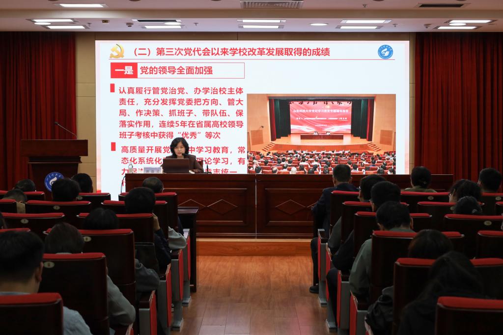 郭益灵从学校第四次党代会基本情况、会议的重要意义和主要成果、会议的主要精神和确保第四次党代会精神落实见效等方面进行了深入解读。她指出,学校第四次党代会全面总结了学校第三次党代会以来取得的成绩和宝贵经验,深刻分析了学校事业发展面临的机遇和挑战,确立了“一三六八十”的战略布局和任务举措,要按照锚定“一个目标”,坚持“三步走”,实施“六大战略”,迭代“八项任务”,升级“十大工程”的战略布局,谱写pp电子游戏官网高质量跨越式发展新篇章。