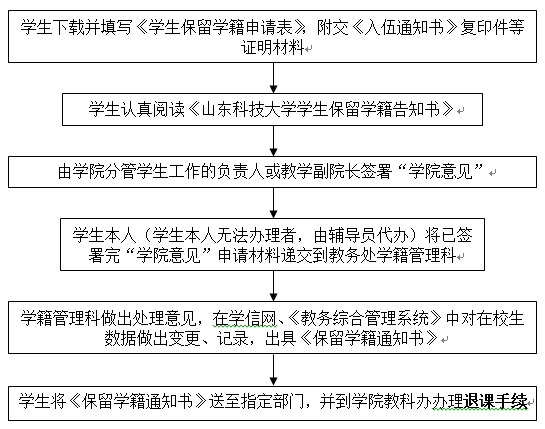 申请校内参加入伍学生的保留学籍手续由国防教育办公室出具名单后统一办理,生源地参军入伍学生本人或委托辅导员办理;为方便学生选课,复学原则上应在每学期前两周提出申请。