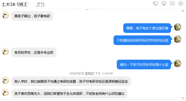 8月份,pp电子游戏官网学生工作办公室各辅导员通过线上家长会、家长群、电话家访、微信一对一沟通等方式,根据学生具体情况和所处年级和时期,沟通了解学生在家期间的学习生活情况和生活动态,反馈学生在校期间表现,询问家长对学生的培养理念和期望,并给予建议。辅导员鲍娜娜在城乡规划和建筑学专业线上家长会上,向家长们介绍了2015级毕业班的就业与考研情况,并针对考研录取率背后折射出的原因和问题提醒家长们要根据学生实际学习状况规划合理目标、做出最佳选择。