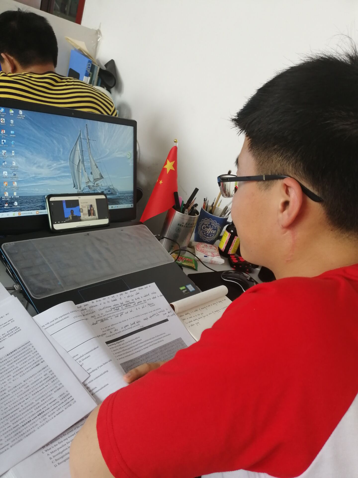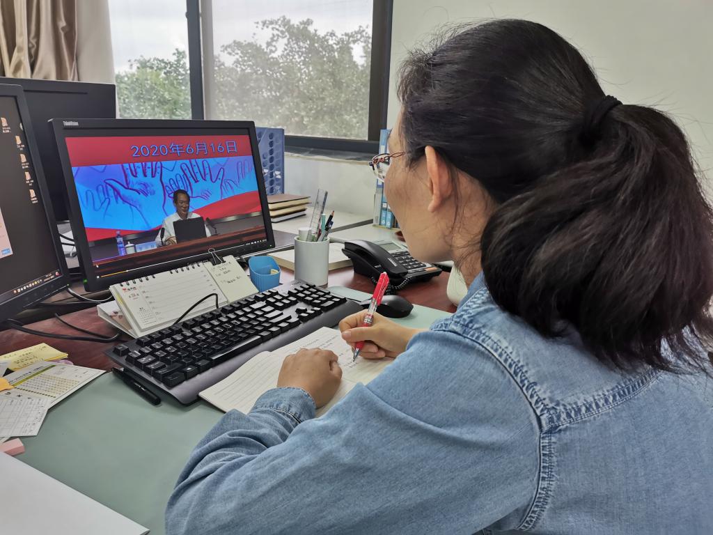 6月16日,pp电子游戏官网组织部分返校学生于J7-215教室收看校党委书记罗公利以“在战‘疫’中我们一起成长”为题的精彩思政课。学院全体学工干部、剩余返校学生、未返校学生均通过网络平台共上思政大课。