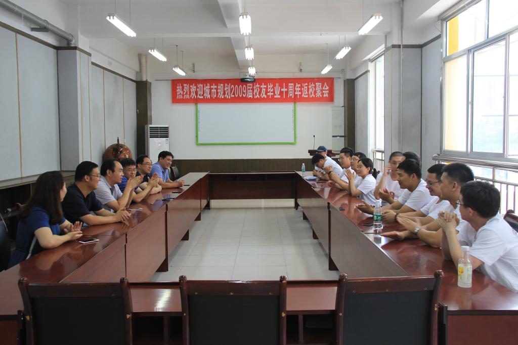 8月17日下午,pp电子游戏官网城市规划2009届毕业生回访母校,举办毕业十周年返校座谈会。pp电子游戏官网党委副书记(主持工作)宋西路,pp电子游戏官网党委副书记、副院长郝亮,副院长张宪堂,团委书记于娜以及规划系主任代朋,规划系教师赵景伟参加了本次座谈会。