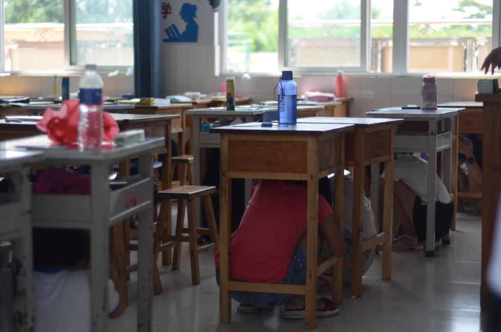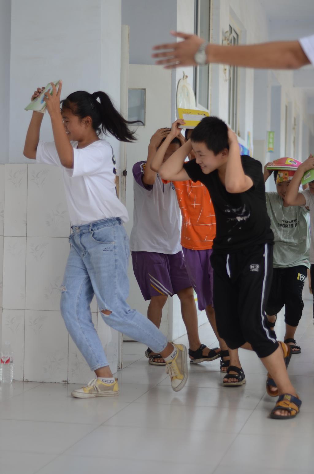 上午11点,伴随着急促刺耳的警报声,地震演练正式开始。讲师团队员迅速组织学生们采取自救措施,他们用胳膊护住头部,有的钻到桌子下,有的蹲在墙角边,当第二次报警声响起时,随着“用手抱头,弯腰低姿,有序撤离”的口令,负责各班的宣讲队员迅速组织本班的学生按照规定逃生路线向外撤离疏散,在指定的安全区域站队,清点人数,汇报情况,整个演习井井有条。最后,讲师团队长朱家璇对本次演练进行了总结,指出了演练中存在的一些问题,同时还对同学们详细解说了除地震外,发生火灾的逃生方法,并对暑期可能会发生的安全隐患进行了讲解。