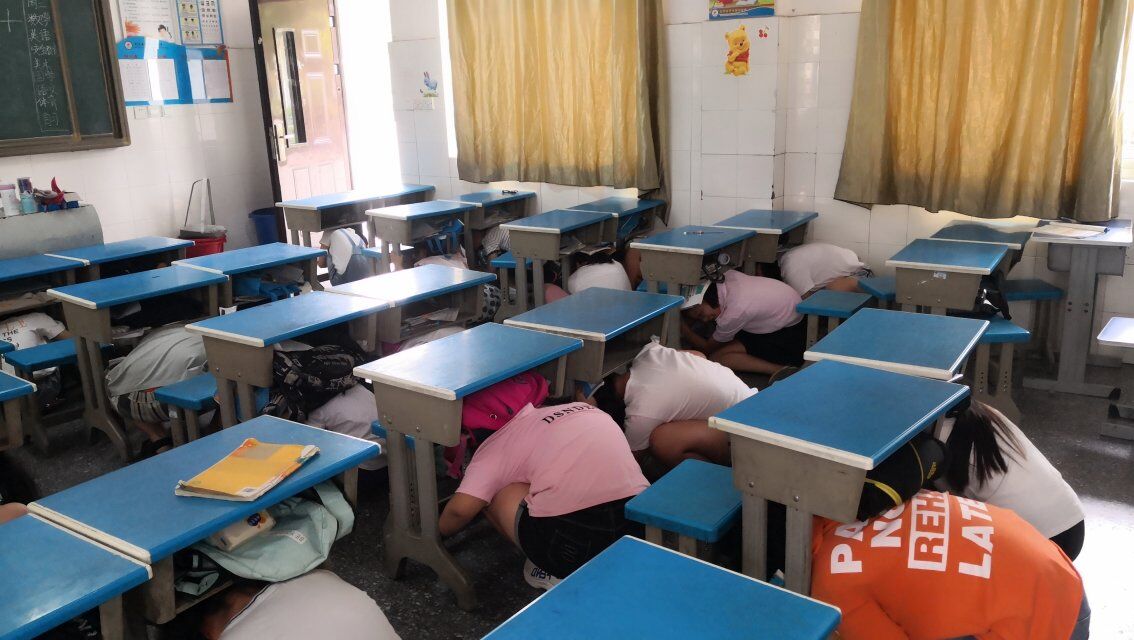 同学们在进行室内地震应急逃生演练