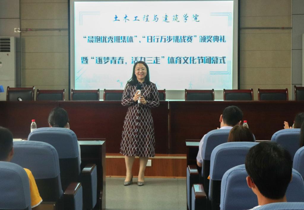 本次会议共分为三项。首先,辅导员张翌宣读了“晨跑优秀班集体”、“优秀领跑者”的获奖名单,公布了“日行万步挑战赛”中“万步达人奖”、“万步先锋奖”及“万步坚韧奖”的获得者。随后,团委辅导员为获奖班级和个人颁发证书。