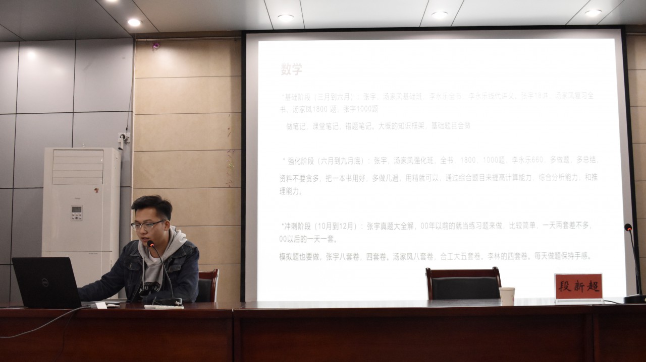 为帮助同学们更加全面且深入的了解考研的相关事宜,帮助同学们更好地规划大学生活,4月8日下午,pp电子游戏官网于J15-219正式启动了2019年考研帮扶项目,举办了“三人青春说”考研交流会第一场。此次交流会邀请了三位优秀的应届毕业生为打算考研的同学们答疑解惑。