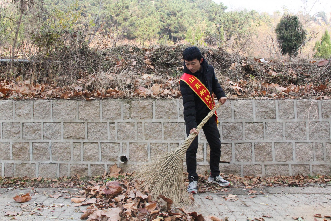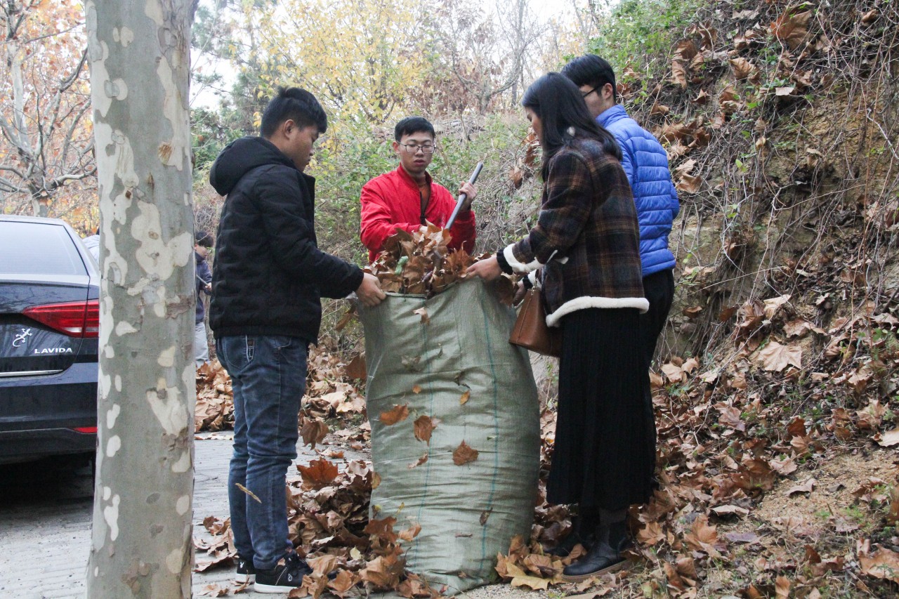 满地落叶像铺成金灿灿的地毯,金秋的落叶堆积了一层又一层。清晨8点整,各学院的志愿者摩拳擦掌,开始合作扫除落叶。志愿者们男女分工,男生负责用铁耙把落叶装进落叶袋,用扫帚把落叶扫到一起,而女生负责把持好落叶袋,让男生的工作更加顺利。一堆堆的落叶不一会填满了一个个编织袋,地上的落叶很快被清理的干干净净,街道恢复了原有的宽敞。汗水滑下了志愿者们的脸颊,但志愿者们脸上都洋溢着开心的笑容。