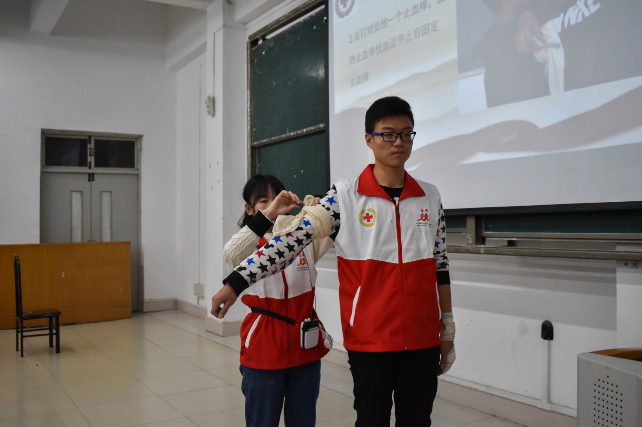 培训会伊始,志愿者便开始对包括骨折、出血等各种常见伤情进行讲解和包扎演示。随后,志愿者又演示了头部受伤、大小臂骨折等的包扎固定方法。为提高在场同学们应急包扎方法的熟练度,现场志愿者们提供纱布等急救用品让学生进行练习。同时校志愿者联合会的志愿者们在场下进行热心帮助,对同学们包扎过程中存在的问题进行耐心解答。培训会最后,志愿者们演示了心肺复苏的全过程。现场两名同学在讲解员的指导下成功演示了心肺复苏。讲解员强调,心肺复苏是一项十分消耗体力的救助方式,如果同学们在实际生活中遇到此类求助人员,应至少两人轮换对该人员进行心肺复苏。讲解员仔细讲解,同学们认真听讲,在讲解员仔细的讲解和志愿者们的帮助下,积极参与练习,收获颇丰。