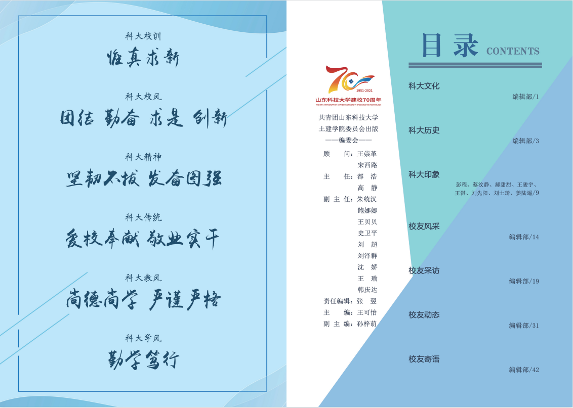 《建设者》校庆特刊由pp电子游戏官网党委指导,学院新闻宣传中心编撰,包含“科大文化”“科大历史”“科大印象”“校友风采”“校友采访”“校友动态”“校友寄语”等七个板块,从不同视角呈现了科大之底蕴、土建之传承,帮助更多校友了解科大发展脉络、土建成长历程。本次校庆专刊特邀泰安、济南、济宁等校友会,以及多位优秀校友为山科送上生日祝福,充分展示了学院校友工作的成果和对科大真诚的祝愿。