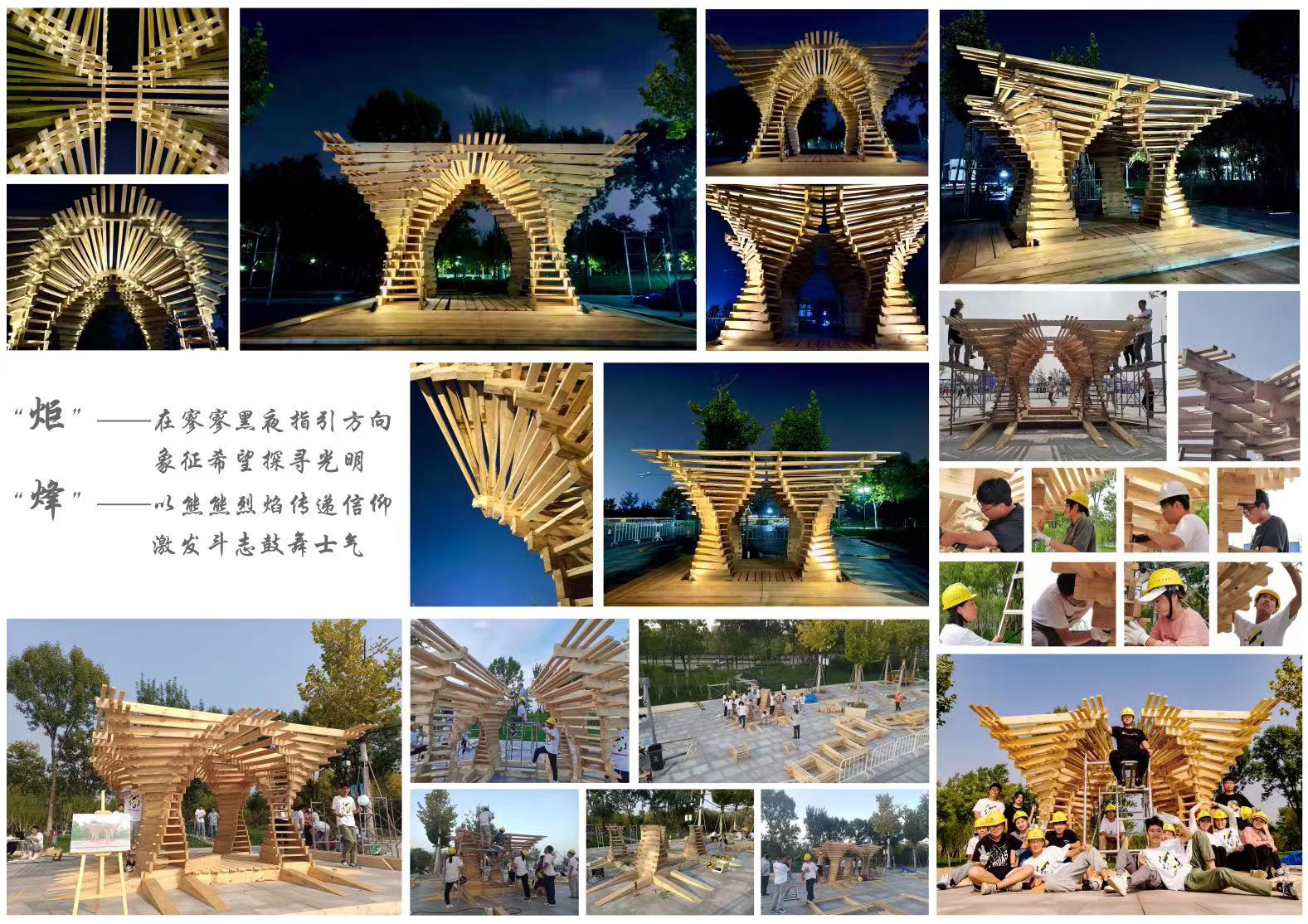 此次木构搭建以“致敬齐长城·发展齐文化”为主题。本次赛事由山东省科学技术协会、山东省教育厅、共青团山东省委员会、山东省发展和改革委员会、山东省人社厅、山东省工业和信息化厅共同主办,中共淄博市委宣传部、山东土木建筑学会、山东建筑大学承办,乡伴文旅集团支持。竞赛共收到来自国内外37所高校学子的236份作品,经省内外专家评选,最终评选出包括我校在内的16所高校大学生组成的7支参赛队伍进入现场搭建阶段。在4天时间内,参赛队伍经历了大雨、酷暑等不利天气,师生通力合作,解决了一系列现场技术问题,以最佳质量完成搭建任务。经过专家评委的严格评审,由我校参与搭建的木构作品“炬烽”获得第一名,我校已经连续两年获得一等奖。