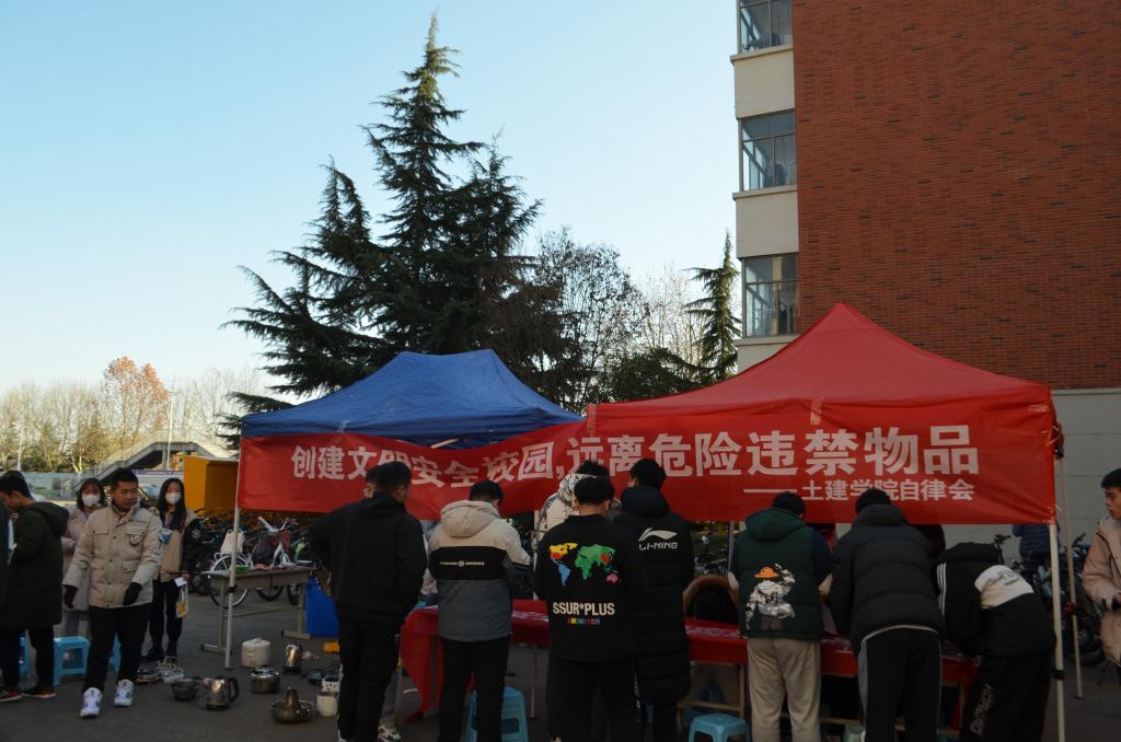 为增强同学们的安全意识,提高同学们对安全防范的认知水平,营造和谐安全的校园环境,11月23日下午,pp电子游戏官网自律会在B2-B4宿舍楼前开展“创建文明安全校园,远离违禁危险物品”安全教育主题活动。学生工作办公室主任朱统汉、辅导员刘超到场进行了细致的指导,传达了学校安全工作精神。