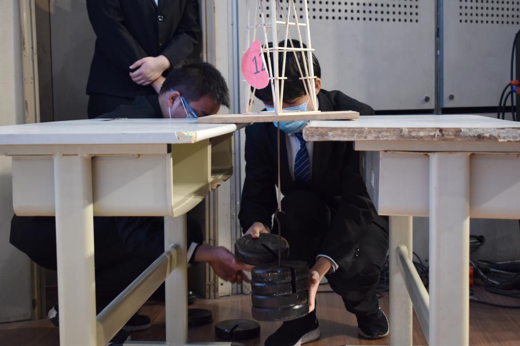 随后,比赛正式拉开帷幕,进入决赛的15组选手分别进行了作品展示和加载测试。第一轮进行的是A组的创模模型展示,该组以“基于立方体的光影探索”为设计命题,选手们用精巧的结构设计,独特的创意思维,为我们展现出光这一自然因素带给我们的视觉冲击和感官体验。之后,进行了B组结构模型的展示及加载,该组以“棱台构造”为设计命题,工作人员在现场对模型的承重部位分别进行了竖向静载和竖向冲击荷载的测试。评委老师对各组的模型进行提问并提出了优化方案。