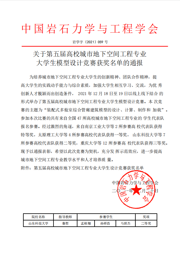2021年12月18日至19日,第五届高校城市地下空间工程专业大学生模型设计竞赛以线上线下结合的方式成功举办。该竞赛由中国岩石力学与工程学会主办的全国性专业技能大赛。由pp电子游戏官网城空与岩土专业本科生组成的pp电子游戏官网团队荣获全国二等奖。