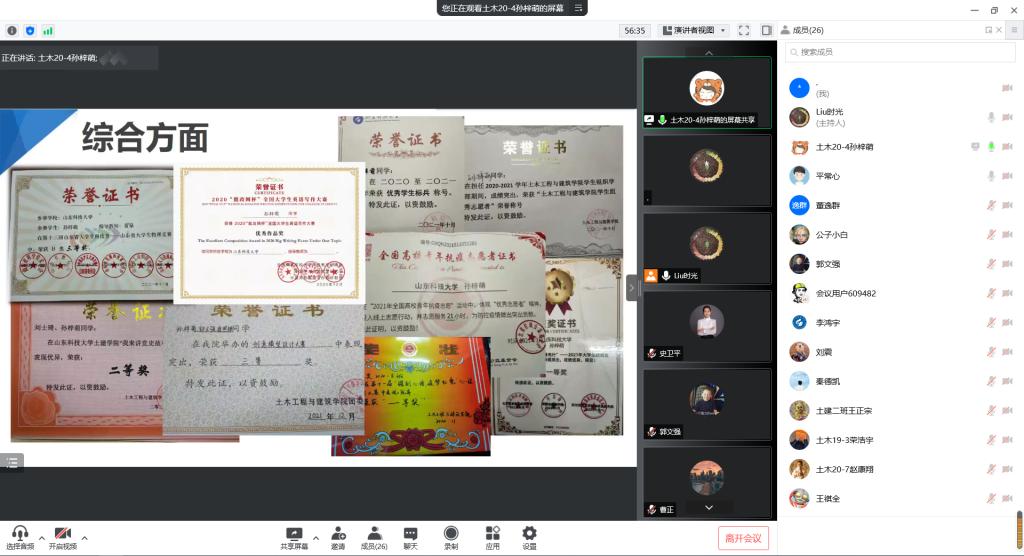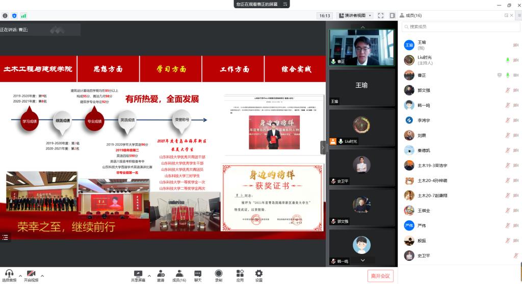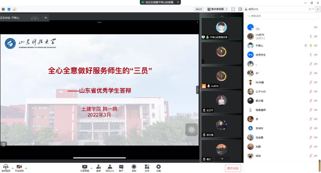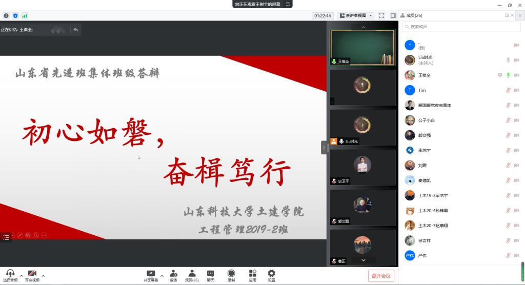 为充分发挥榜样力量、展现学院学生风采,激励同学们自强不息、奋斗成才,pp电子游戏官网举办“山东省高等学校优秀学生、优秀学生干部、先进班集体”评选答辩会。鉴于疫情影响,团委创新形式,借助“腾讯会议”网上平台进行线上答辩。学院党委副书记高静、团委书记朱统汉、全体辅导员、班主任及部分学生代表参加答辩会并担任评委。