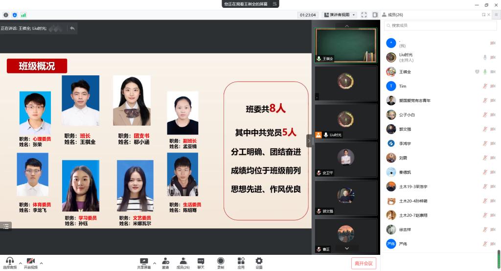 经过前期自主申请、初步评比筛选,共有13名本硕学生进入答辩环节。他们从思想动态、学习状况、学生组织工作、科研创新、社会实践和对未来的展望等多个方面全方位、多层次地展现自己。稳居前列的学习成绩、优异的科研成果、丰富的志愿服务和社会实践经历……答辩过程中,候选人自信大方,4分钟的答辩既展示了自己取得的成绩,又分享了奋斗史上的心路历程和感悟收获,让评委老师和同学们充分看到了他们身上的发光点,感受到他们一路走来披荆斩棘的坚持。紧接着进行的是优秀班集体的答辩,答辩人就班级特色制度、班级团日活动、班级学风建设等多个方面详细具体的介绍了班级的优秀氛围与成果,获得老师和同学们的一致好评。