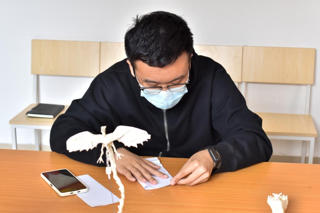 活动邀请了“折纸少年”孙洪涛带领同学们折“抗疫‘大白’”。活动伊始,孙洪涛向大家介绍本次折纸活动的内容,并细心讲解了的制作要领。同学们各种折纸手法层出不穷,捡、挑、捏、压、翻、挤、拆、插,薄薄的纸片在他们手中舞出了生命,一个个可爱的“抗疫‘大白’”汇聚在一起,展现了医护人员和志愿者众志成城战胜疫情的信心和力量。