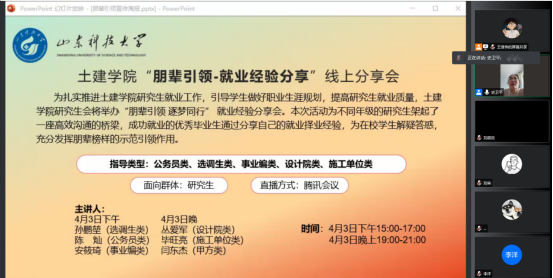 为扎实推进研究生就业工作,引导学生做好职业生涯规划,提高研究生就业质量。4月3日,pp电子游戏官网研究生会在线上举办“朋辈引领,逐梦同行”就业经验分享会,邀请孙鹏堃、陈灿、安筱琦、闫东杰、丛爱军、毕旺亮六名优秀毕业生分享择业就业经验。本次分享会由pp电子游戏官网研究生辅导员史卫平主持,200余人参与活动。