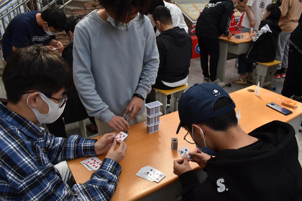 此次比赛要求参赛选手利用组委会提供的材料——1副纸牌和一瓶仅用于扑克的粘结胶水,按照统一题目《巧垒纸牌》完成结构模型制作,制做结构时必须保证每一张纸牌的完整性,不能剪开但可折叠。参赛选手需要在规定时间20分钟内用纸牌和胶水进行结构设计,在能承受住1kg荷载的情况下,高度越高得分越高。