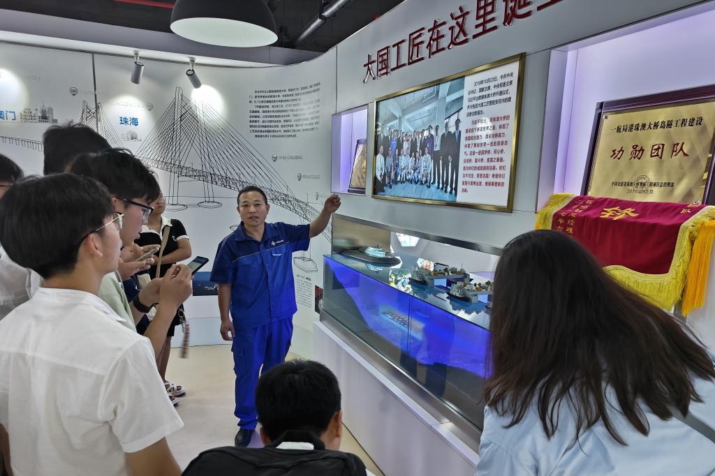 学员们随中交一航局二公司人力资源部、党委组织部部长高作光一起参观了大国工匠工作室,全国首批大国工匠获得者管延安为学员进行具体讲解与交流。管延安用生动的语言讲述了港珠澳大桥等重点工程建设,讲到沉管隧道施工,他说“岛隧工程建设难度大,技术最复杂,施工历时7年,33节沉管,每节都有180米长、8万吨重,在每一件设备、每一颗螺丝安装完后,都要反复检查三至五遍才放心。”现场掌声频频,学员陈钰滢表示“当管师傅脱口而出每一个构件的精准尺寸与精确误差时,我认识到自己平时不以为然的小小数字在工程建设上容不得丝毫马虎,管师傅的工匠精神是我们学习的榜样,以后我一定在学习生活中更加细心严谨。”