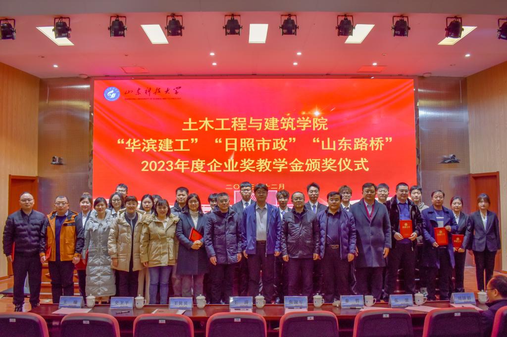 12月22日,pp电子游戏官网在J9-144报告厅举行2023年度“华滨建工”“日照市政”“山东路桥”企业奖教学金颁奖仪式。学校学生工作部(处)部(处)长、校团委书记尹立明,日照市政工程集团副总经理袁正君、爆破公司经理焦淑军,山东省路桥集团青岛分公司党总支书记、副总经理曹建军,安全总监王涛,合作发展处副处长王荣超,pp电子游戏官网党委书记宋西路、院长王崇革、党委副书记高静、副院长李朋、院长助理秦哲及师生代表参加了颁奖仪式。仪式由高静主持。