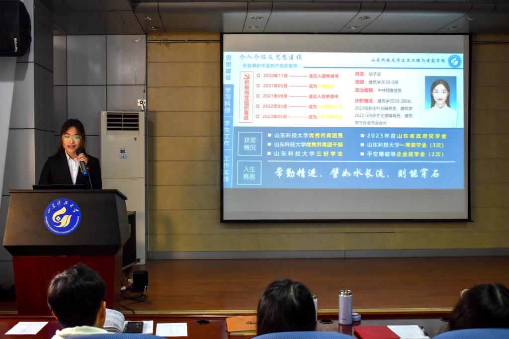 经过前期自主申请、资格复核、初步评比,共有8名本硕博学生、三个候选班级进入答辩环节。答辩会上,学生分别围绕思想动态、学习科创、学生工作、社会实践、个人奖项等方面依次展开,充分展示了土建学子的优秀风采;参选先进班集体的三位班级答辩人通过班级建设、学风建设、班级成果、班级成员风采、社会服务影响力等方面展示各自班级的特色与优秀之处,展现了学院班级建设优秀成果。