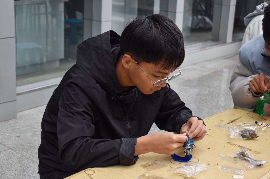 学生们在活动中尽情地展现自己的想法,将香草装入布袋内,根据各自的想法进行香囊的制作。从装填香料到穿针引线,学生们全身心的投入参与香囊的制作,无不展现他们的奇思妙想。在活动中,参与者相互合作,遇到制作问题就相互虚心求教,在合作中完成了各自的作品,做出了各形各色的香囊,展示了学生们的优秀的审美素养。