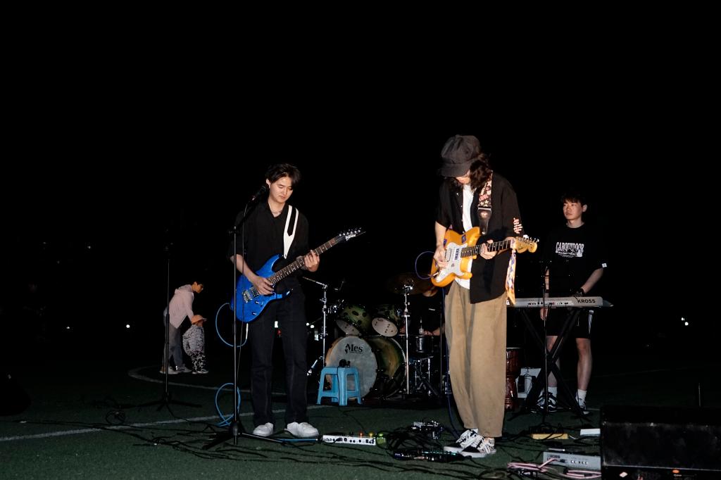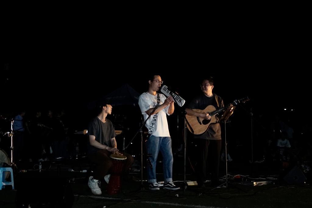 “虹海的羊”乐队又为大家带来了《心动风铃》《那个女孩》《一万次悲伤》等歌曲,现场呼声四起,整个操场彷佛成为音乐的海洋。现场带来的歌曲获得大家的掌声,将音乐会推向高潮。