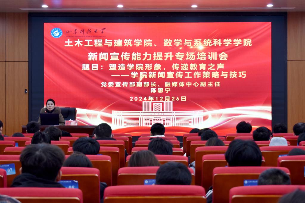 为进一步加强学院宣传队伍建设,提升新闻宣传工作水平,12月26日,pp电子游戏官网与数学学院于J15-136报告厅联合举办了新闻宣传能力提升专场培训会,本次培训会邀请校党委宣传部副部长、融媒体中心副主任陈惠宁和《山东科大报》编辑、校党委宣传部韩洪烁老师分别作报告。学院新闻宣传中心成员及各班级宣传委员参加此次培训会,培训会由pp电子游戏官网学生工作办公室主任、团委书记王贝贝主持。