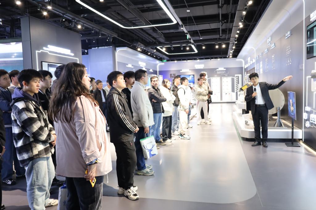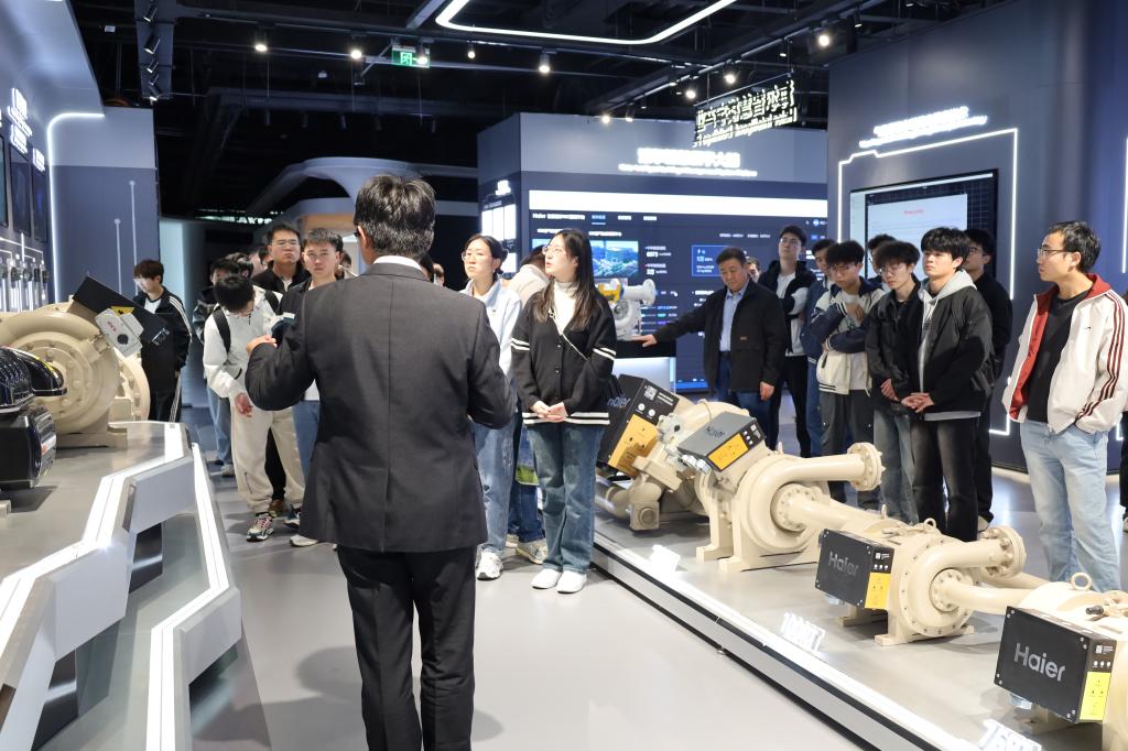 在海尔智慧楼宇市场推广总监谷广普、经理崔仕华、吴雁飞等陪同下,师生参观了海尔智慧楼宇产业展厅,全面了解企业发展历程与文化理念,重点观摩了VPC变频技术、高效暖通系统及智慧建筑能源解决方案等前沿产品与空调系统。通过现场体验智能控制系统,同学们对专业理论在工程实践中的应用有了更直观的认识。