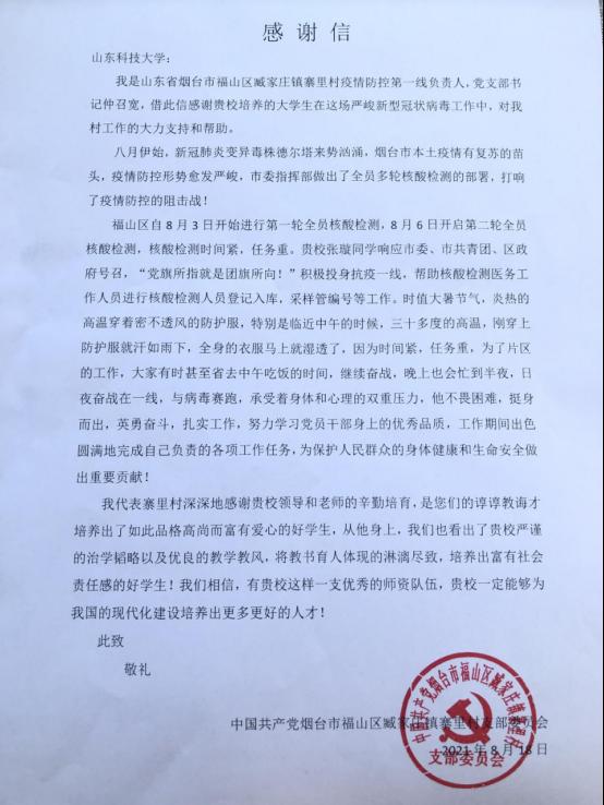 近日,pp电子游戏官网收到中共烟台市福山区臧家庄镇寨里村支部委员会的感谢信,了解到pp电子土木工程2019级2班学生张璇在暑假期间主动站到了抗“疫”前线,在烟台市福山区臧家庄镇寨里村一线参与全员核酸检测工作。