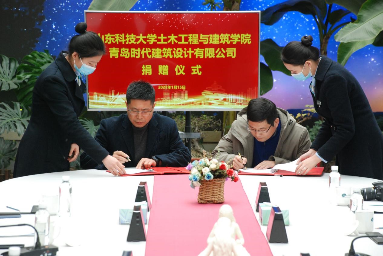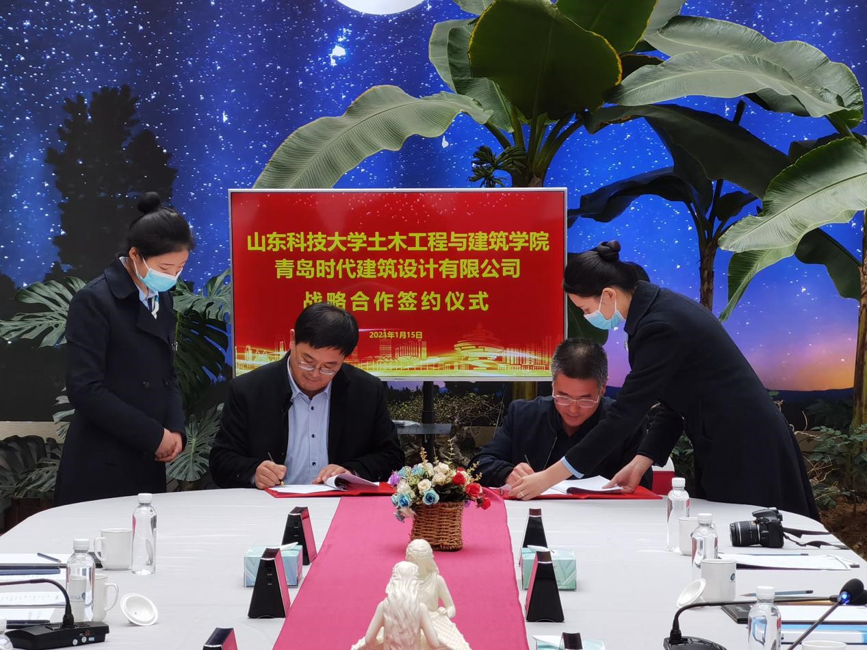 宋西路和于海鹏共同为“pp电子游戏官网大学生就业创业实践基地”“pp电子游戏官网教学实践基地”揭牌,并代表双方签署《校企合作协议》《BIM合作协议》等4份协议。薛力、青岛时代建筑设计有限公司综合办主任沈新宇代表双方签署《奖学金捐赠协议》等2份协议。